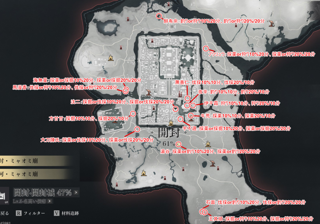 | 御苑・北 | 大刀陳氏 | 薄造り刺身 | 15 | 採薬の会心率+10%または伐採の会心率+10% | 20 | |